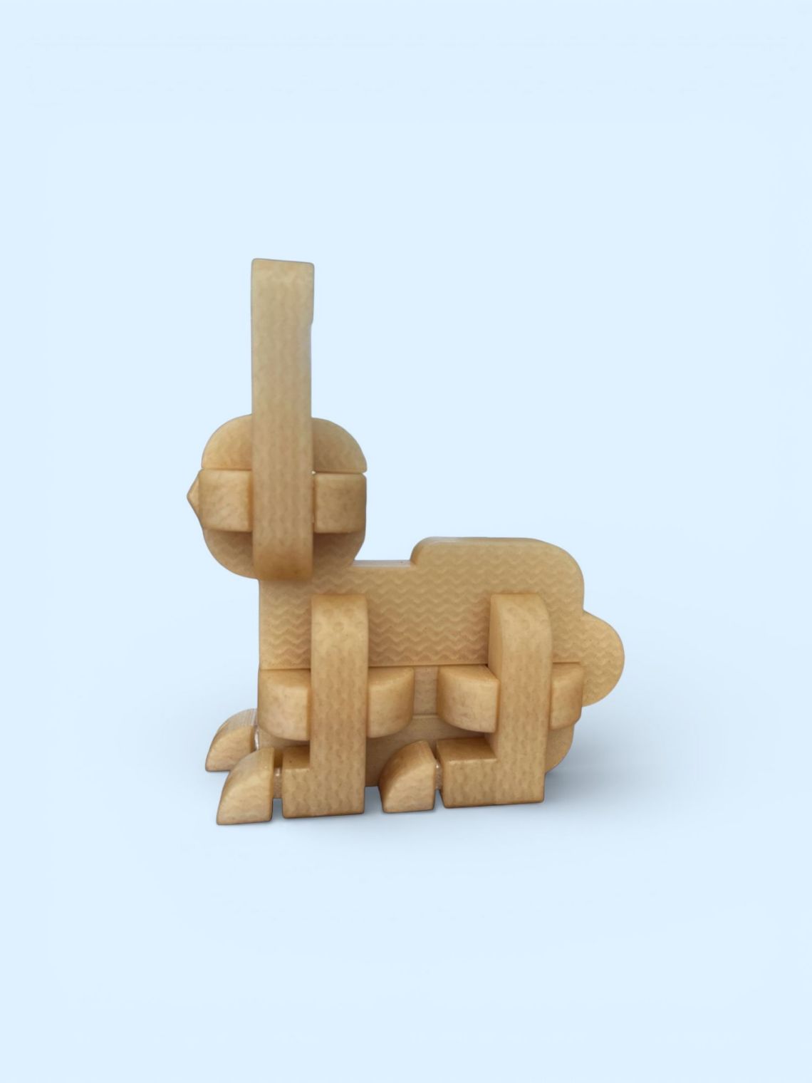 Ce puzzle se compose de 18 pièces avec des trous, assemblés avec 15 goujons, plus 4 fixations à emboîtement pour les griffes, et une fixation supplémentaire à emboîtement pour sécuriser le dos et la tête au reste du corps.