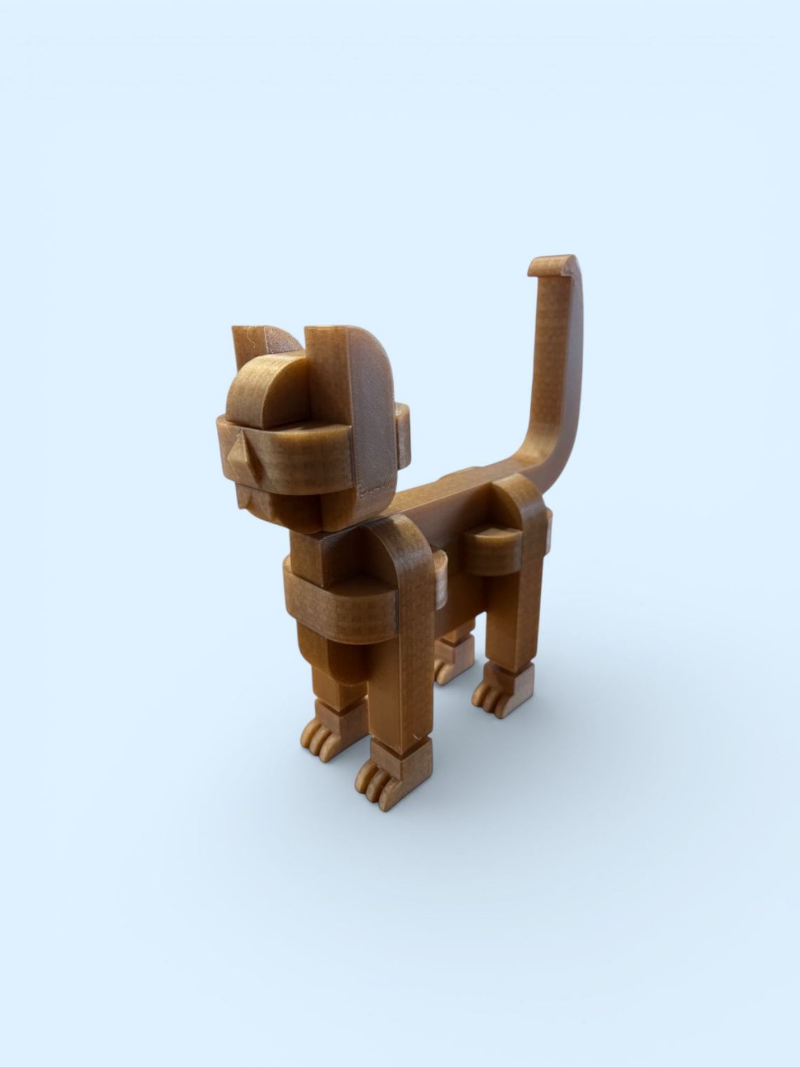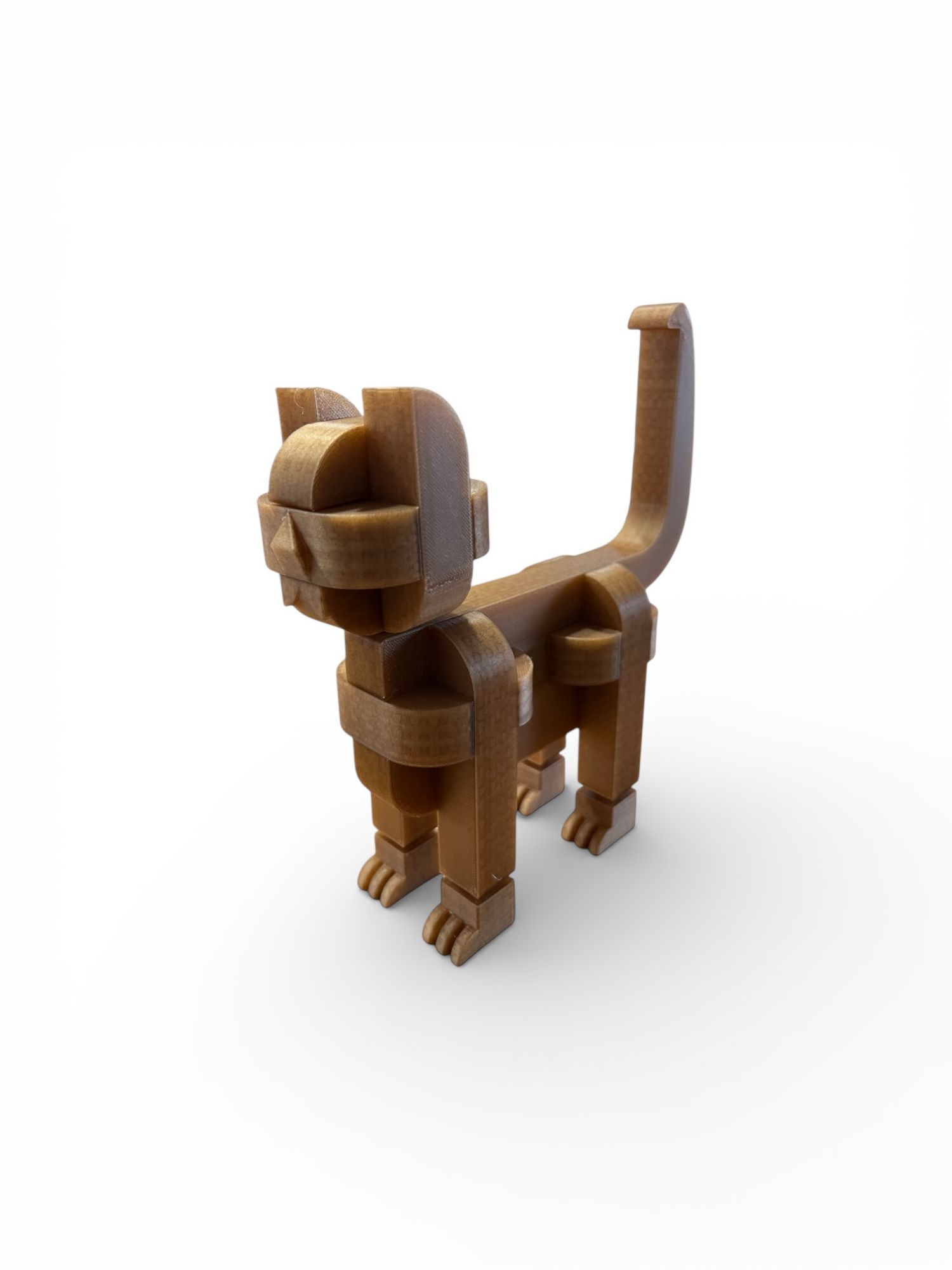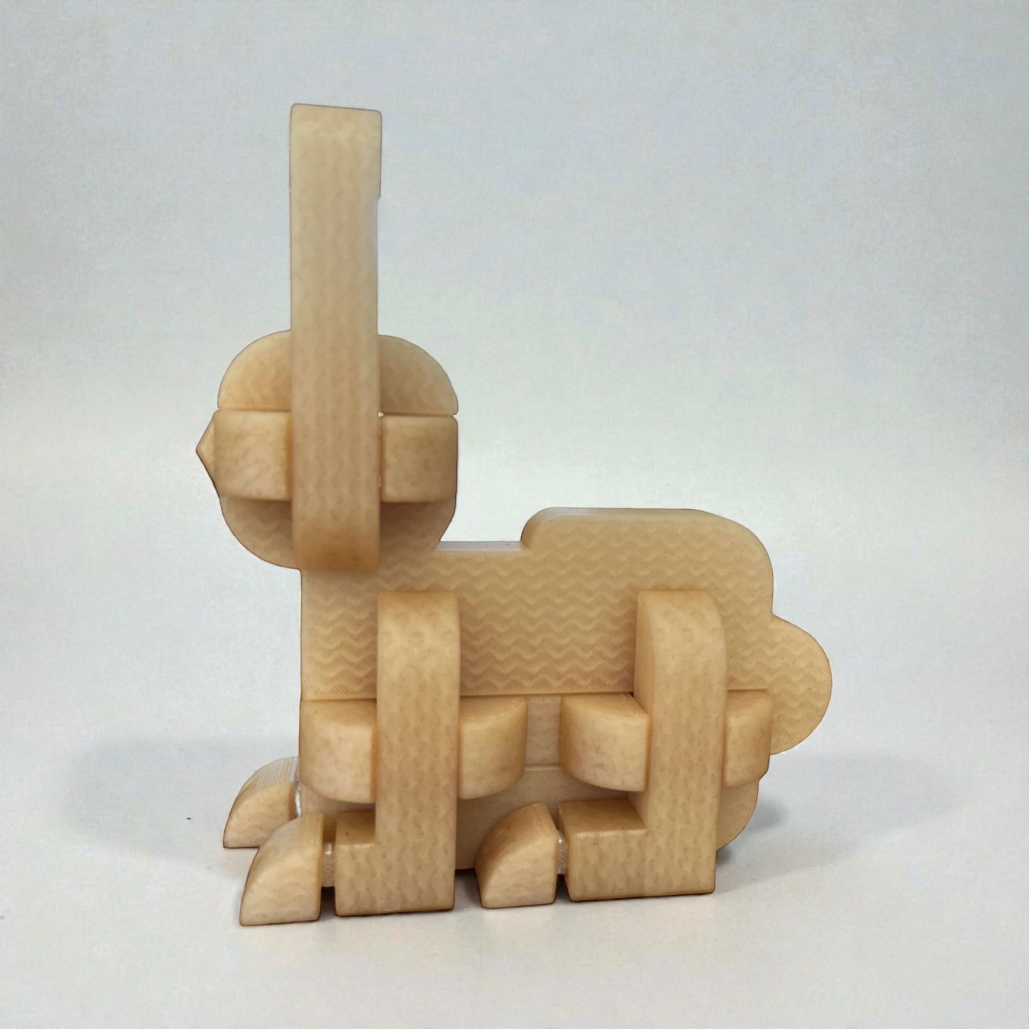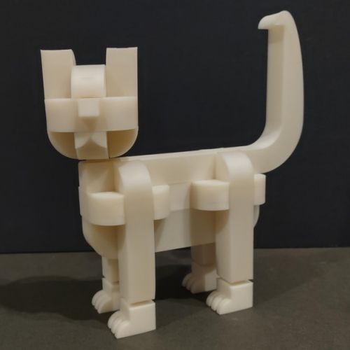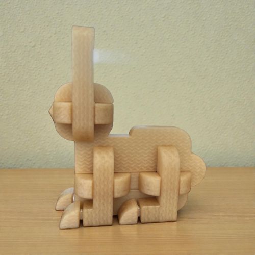 Ce puzzle se compose de 19 pièces avec des trous, assemblés avec 15 goujons, plus 4 fixations à emboîtement pour les griffes, et une fixation supplémentaire à emboîtement pour sécuriser le dos et la tête au reste du corps.